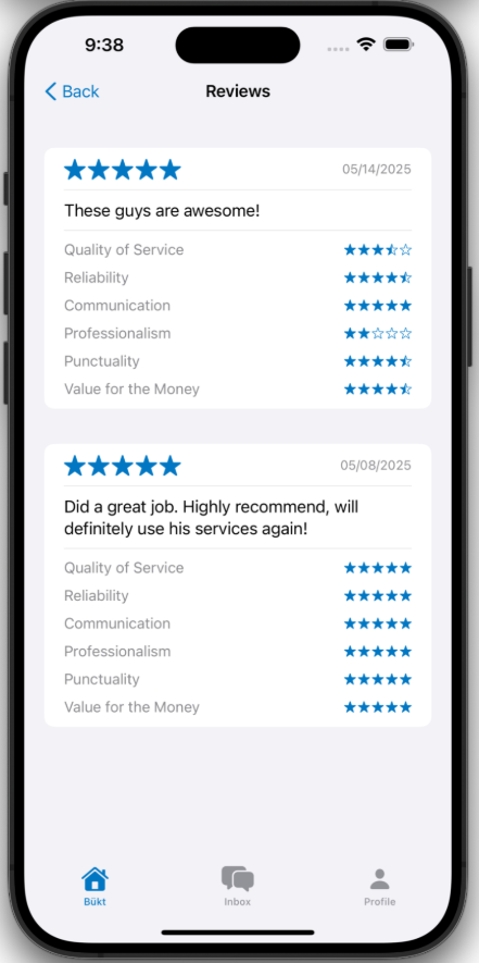 With Bükt, we give the local consumer opportunity to review your interactions in our platform. As you service local Consumers, respond to their needs – Consumers are invited to rate their interaction with you in the Bükt app. Quality Business reviews help your local community value your business and create trust with prospective clients!